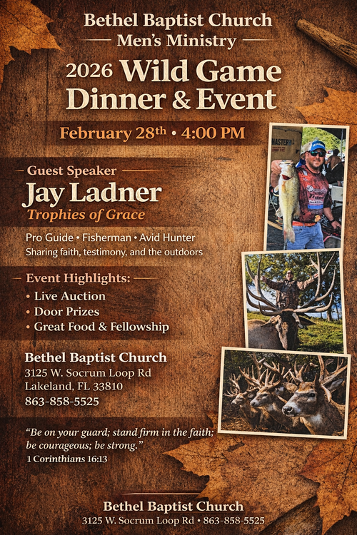 Church and various need in our community. *Our Annual Wild Game Event is our major outreach to men, women, boys and girls with the gospel of Jesus Christ.*